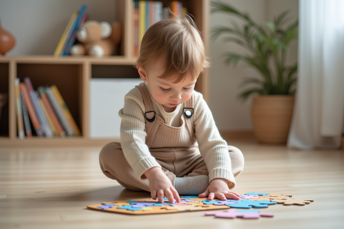 Tout-petit en train de jouer avec un puzzle coloré dans un salon chaleureux