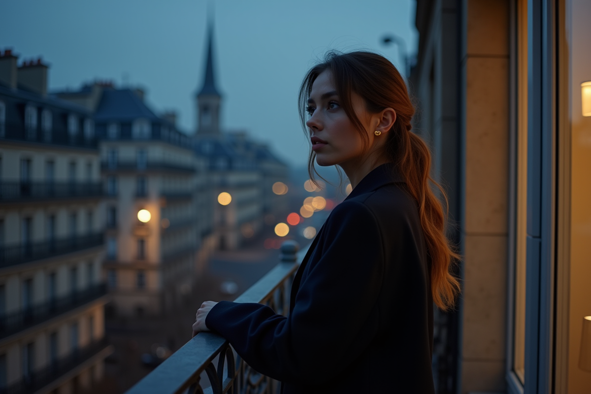 Femme élégante sur un balcon parisien la nuit